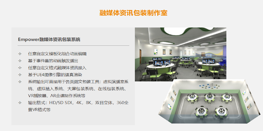 融媒體資訊包裝系統(tǒng),任意自定義模板化組合動畫編輯,基于事件量的動畫觸發(fā)播出,任意自定義格式融媒體資訊接入,基于UE4圖像引擎的逼真渲染,系統(tǒng)輸出可直接用于各類圖文包裝工具:虛擬演播幸系統(tǒng)、虛擬植入系統(tǒng)、大屏包裝系統(tǒng)、在線包裝系統(tǒng)、VR播放器、AR金課制作系統(tǒng)等。輸出格式:HD/SD SDl, 4K, 8K,雙目立體,360全景VR格式等。針對融媒體演播室的各個景區(qū)采用藍箱摳像的VR方式、實景舞臺的AR植入方式、大屏包裝顯示方式等對欄目的各個環(huán)節(jié)進行全方位點文結(jié)合圖文包裝;各類融媒體資訊接入, 將各關(guān)融媒體資訊接入欄目制作與播 融媒體資訊包裝系統(tǒng)提供了大量 數(shù)嘉可視化模板,如柱狀圖、餅 還可實現(xiàn)主持人嘉兵和觀眾之間的互動與交流,提升節(jié)目的參與度與活躍度;數(shù)據(jù)可視化。不僅融入了很多新媒體元素、內(nèi)容、方法和手段,實現(xiàn)了各媒體之間深度融合與互動,狀圖、折線圖、散點圖等,可根據(jù)數(shù)據(jù)支化做實時呈現(xiàn)。